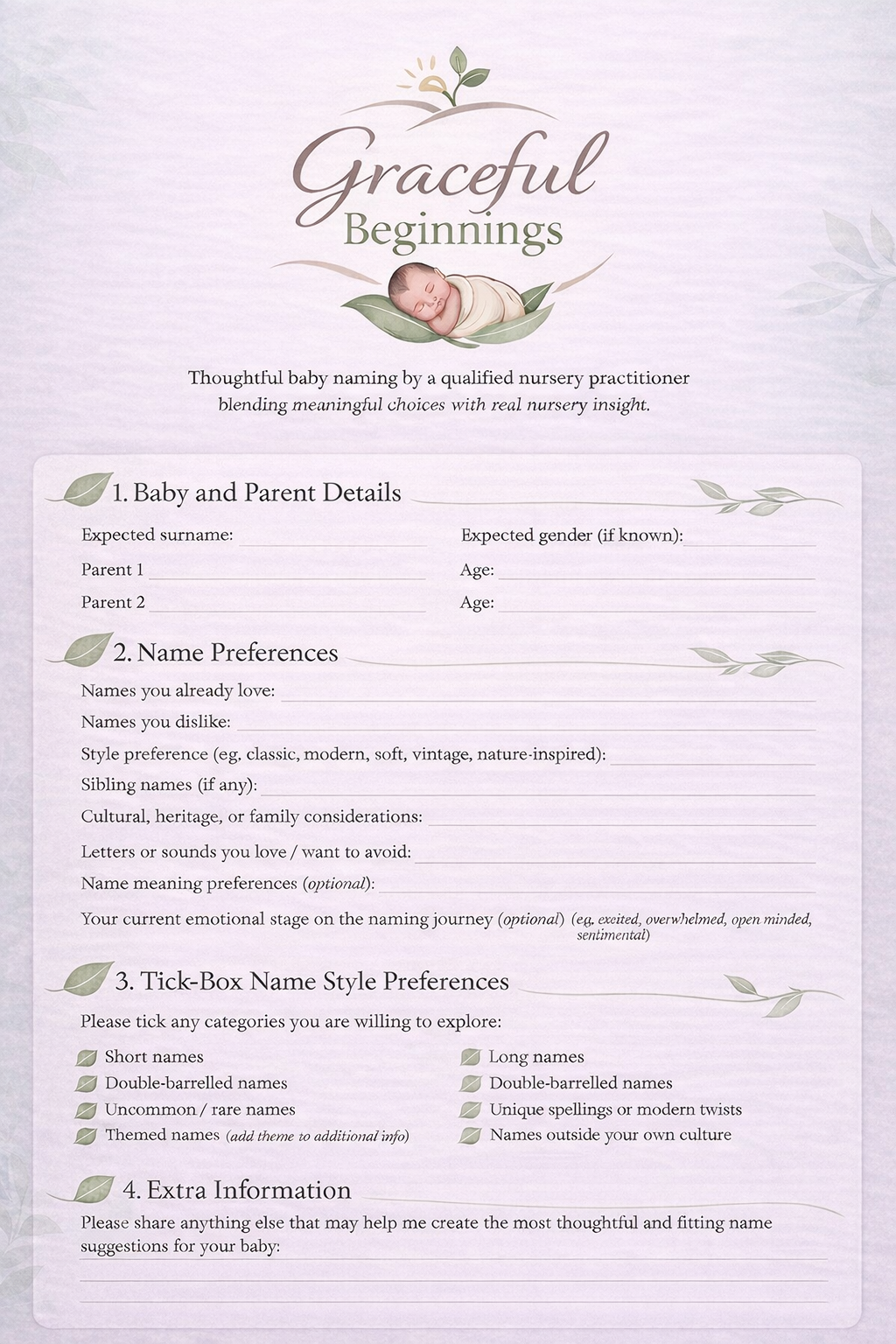 Welcome to Graceful Beginnings. This 'Preference Sheet' is designed to help us understand your unique vision for your baby's name. By sharing your thoughts, you'll provide us with the essential details needed to craft a truly special selection, delivered right to your email.