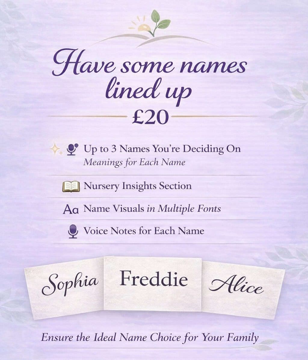 You already have a name or up to 3 names in mind that you would like the meanings for, nursery insights and font and voicenotes so you can be certain? This is the package for you.